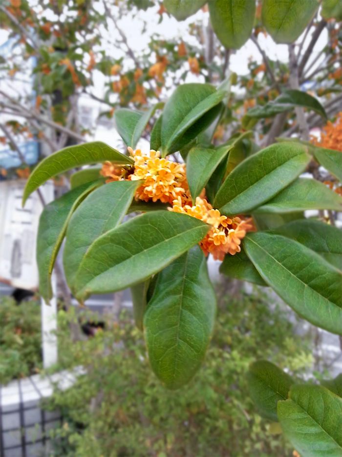 金木犀、銀木犀:モクセイ科モクセイ属の常緑小高木。単に「木犀」とあるときには通常銀木犀を指すことが多いですが、金木犀を含む総称としても用いられています。生垣、街路樹として人気があり、特に金木犀は秋に芳香をもった小花をいっせいに咲かせます。
