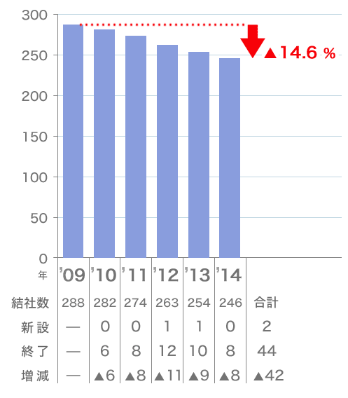 - 2009年から2014年にかけて、短歌結社数は288社から246社へと14.6%減少した。