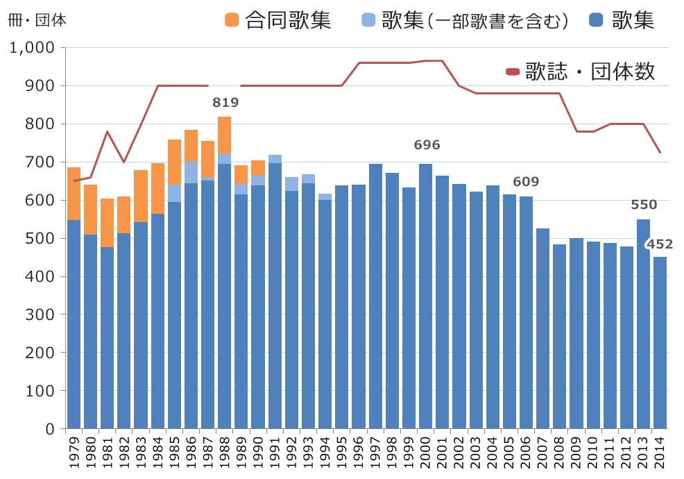 - 年平均で587冊。合計11,737冊の歌集が刊行された。