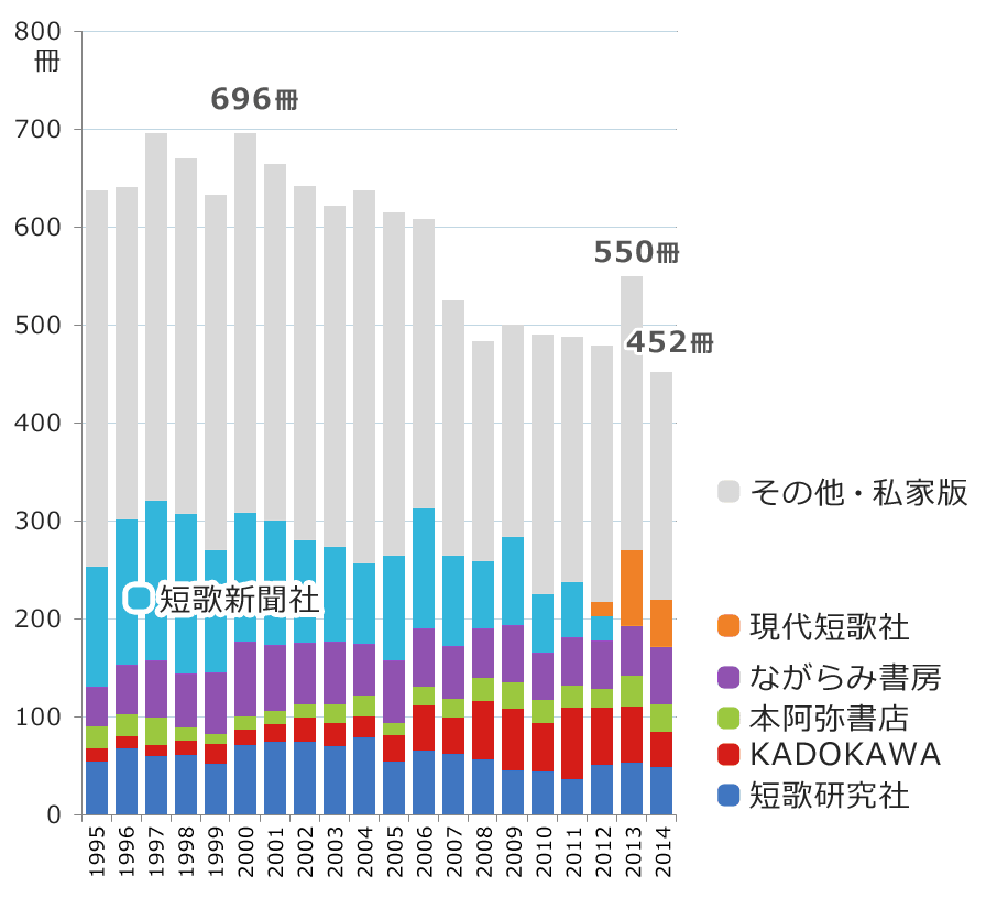- 13冊の刊行しかなかった1995年と比べると、飛躍的な増加があり、歌集出版業への注力に明確に梶を切ったことが分かる。