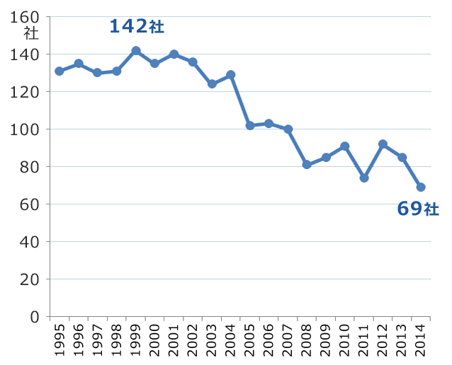 - 2004年の79冊から、2011年の37冊へと半数に数を減らしつつも、2014年には49冊に回復。