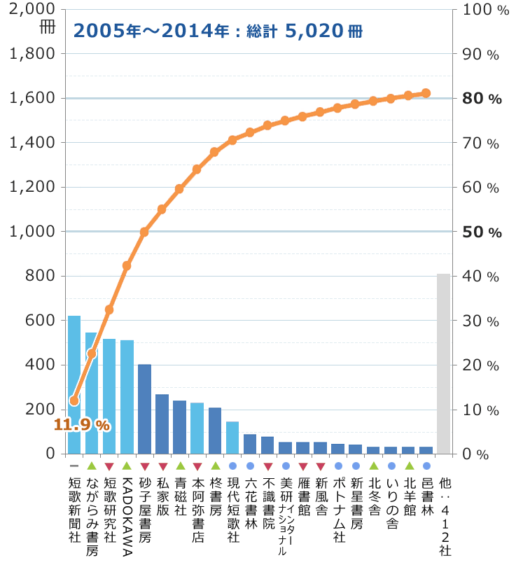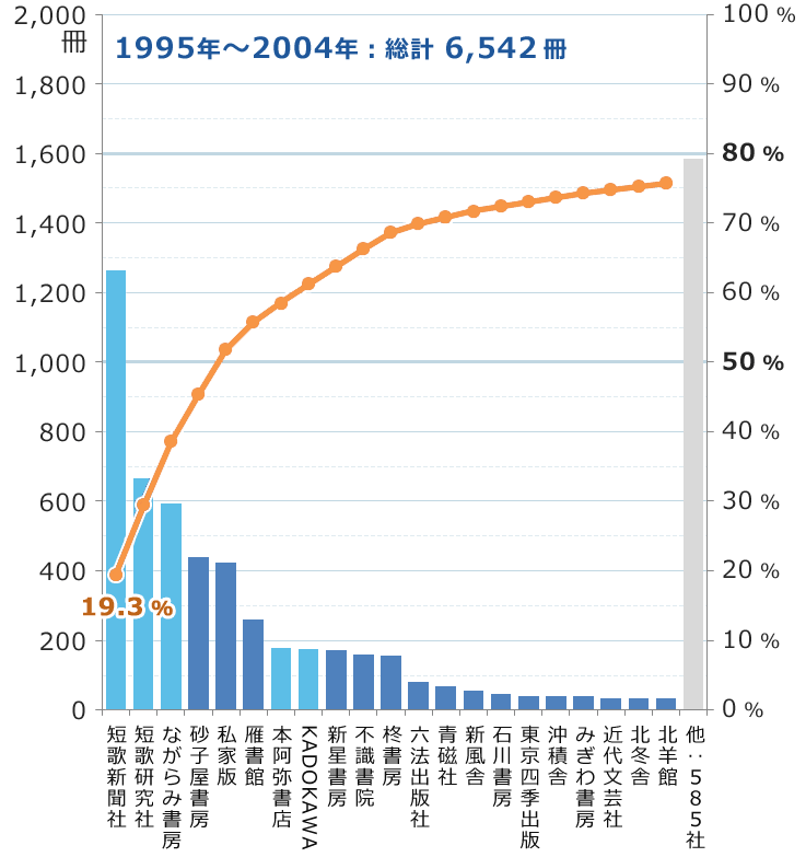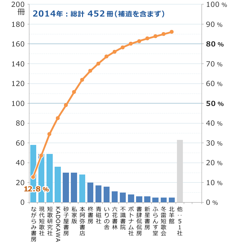 * 橙色の線は累積構成比を示す。例えば、ながらみ書房から砂子屋書房までの5社による刊行数の合計が、総刊行数の約49%(右軸)を占めることを示す。[データ元:短歌研究社『短歌研究』2014年12月号「短歌年鑑」]