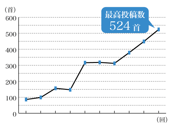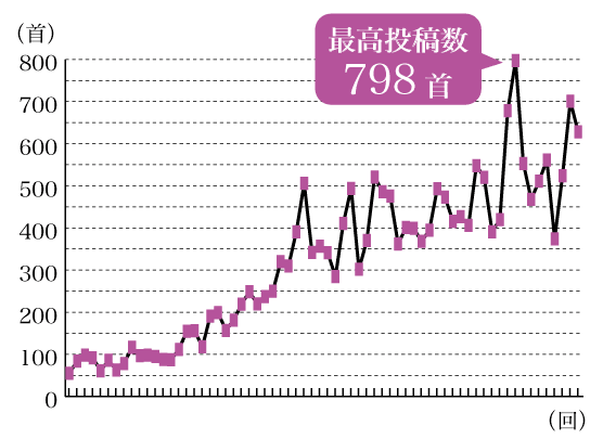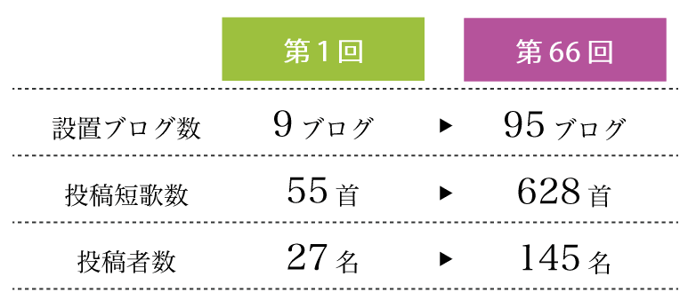 数字で見ると、第1回(テーマ「お祭り」)では27名から55首の投稿。現時点での最新回である第66回(テーマ「終」)では145名から628首の投稿をいただいています。テーマによって投稿数の増減はありますが、第40回以降はほぼ毎回100名を超える方がご投稿くださっています。設置ブログ数も100に迫る勢いです。今回あらためてデータを振り返ってみて、「うたらば」がネット上で短歌を詠む方々の投稿先のひとつとして少しは認識していただけてきたのかな、と手前味噌ながら少々安堵してしまいました。もちろん、まだまだこれからですけどね。
