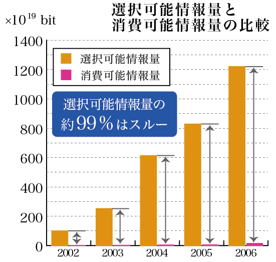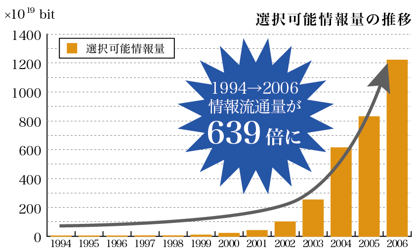 突然ですが、ガム市場は近年、急速に縮小しています。「若者の○○離れ」にちなんで「若者のチューイングガム離れ」などと呼ばれたりもしています。以前に本業の広告屋のほうで某社のガムのCM制作に関わっていた時に聞いた話ですが、なぜ若者がガムを噛まなくなったのか、その原因は非常に意外なものでした。それは、スマホの普及にある、というもの。何かの調査結果に基づく話ではないらしいですが、かつて何となくガムを噛んでいた電車内の時間が、スマホのゲームやLINEなどに集中する時間に取って代わり、ガムを噛む必要がなくなったという、言われてみればたしかにそのとおりの話です。2000年代に「情報爆発」が起こり(図1・図2)、世の中に情報が氾濫している時代。24時間、365日という限られた時間をテレビやネット、スマホゲームなど様々なコンテンツが奪い合っていると考えるのが近年のコミュニケーション・プランニングの基本になっています。