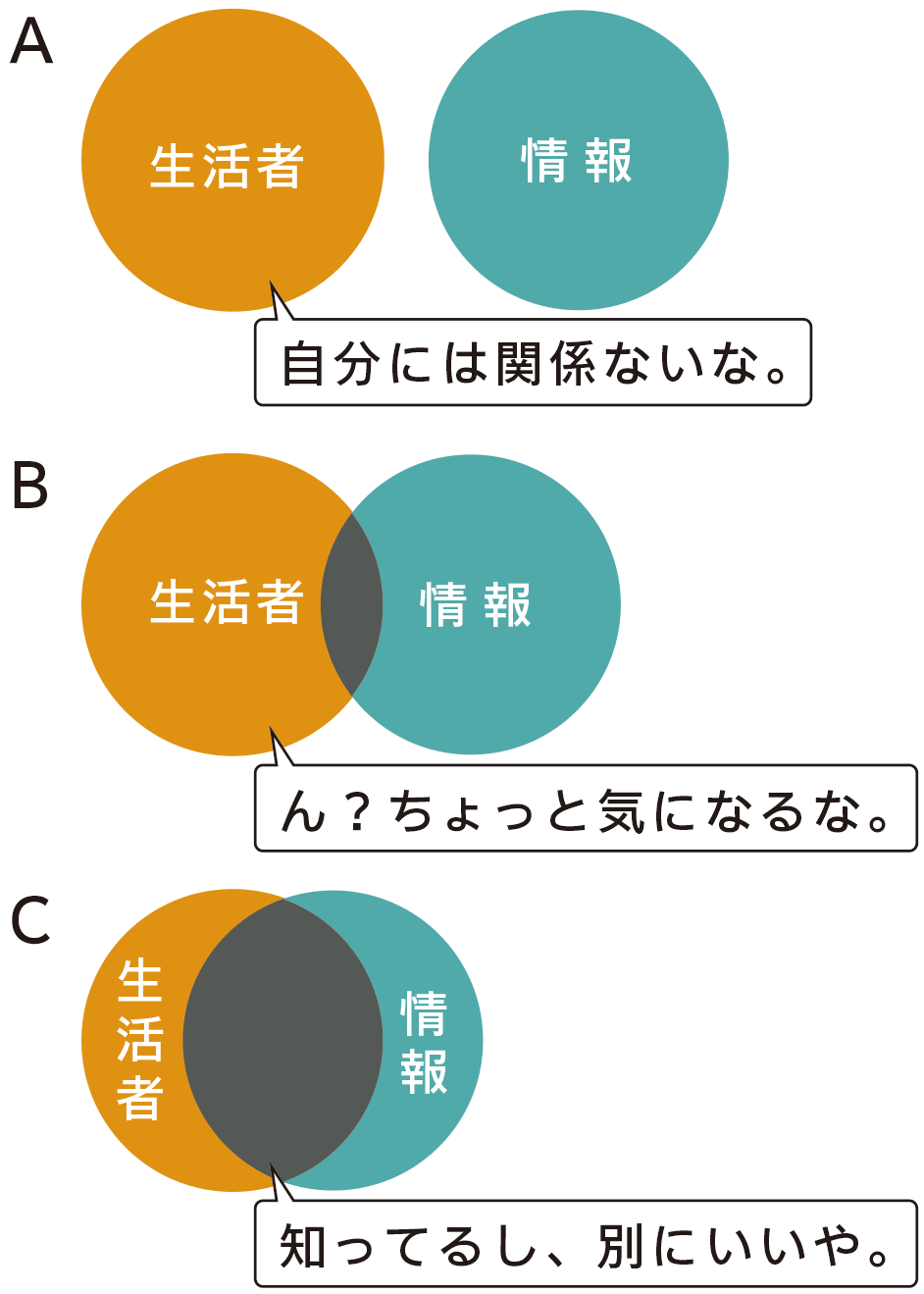 スポーツでも広告でも恋愛でも、何かを始めるときはまず相手を知ることから始めるのが基本。今回のターゲットは普通に生活をしている人、です。そんな人たちが周囲の情報とどんな風に接しているのかを簡単に図式化してみました。