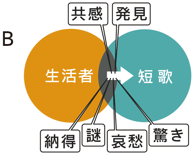 作者の中ではきちんと完結していても読者にそれが伝わらないと「無関係」という判断を下される、Aの状態になります。一方で、Cの状態は恋歌において発生しやすい印象があります。小説やドラマや楽曲で多く取り上げられる恋というテーマは読者も接触経験が多く、表面的な感情やありがちなシチュエーションでは「どこかで見た気がする」と前向きに接触してくれないリスクがあります。もちろん恋というテーマ自体は読者の共感を得やすいため、うまく作れば深く刺さる短歌になるのですが、Cの状態になるリスクは他のテーマに比べると高いでしょう。同様に、社会風刺の作品も世論と同じことを詠っているだけではCの状態になる確率は高いと思われます。もちろんこれだけで選歌をしているわけではないですが、自身の作品がAやCの状態でないかをチェックするだけでも、「うたらば」という土俵の上では非常に重要なポイントになることは間違いありません。