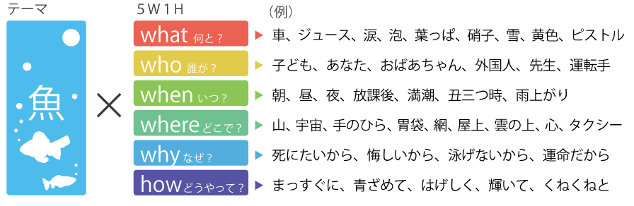 たとえば、「魚」というテーマがあったとします。ここに英語でいうところの5W1Hを掛け合わせて考えてみましょう。掛け合わせるものは何でもいいのですが、僕は5W1Hを使うのが比較的整理しやすくて好きです。各項目を穴埋めするように掛ける相手を探していくと、下記の表のようになりました。