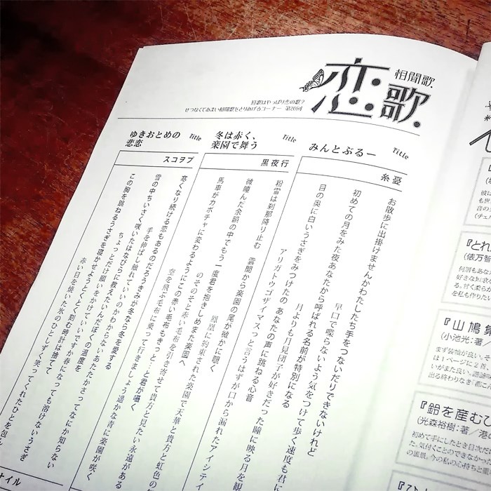 二人一組で恋する気持ちを詠み合うコーナーなのですが、近ごろ投稿数が急増しています。このコーナーは作ったものの、一向に投稿数が増えず、もうやめてしまおうかと思った時期もありました。少ない時期は1ページに2作品掲載だったのですが、ページ割の都合上、1ページに3作品になりました。今号は7作品14名の掲載です。組み合う相手がいつも同じ方もいれば、変わる方もいます。もちろん年齢性別に制約はありません。