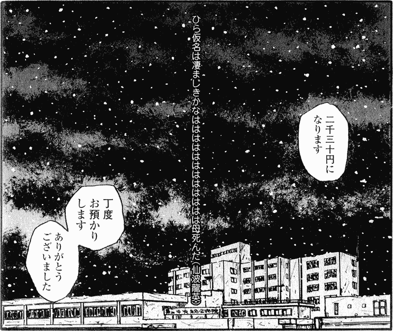 作品の中盤で、TV局の乗っ取りを企むも失脚した安土の父はこの世を去る。葬儀のために安土が青森の実家に帰省すると、父から寺山修司の短歌が遺されていた。