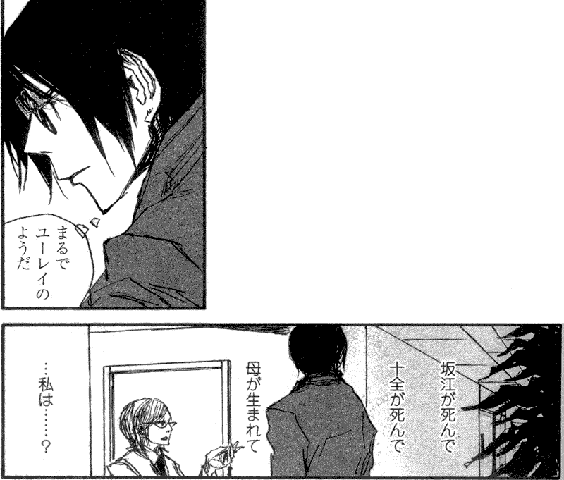 『茜新地花屋散華』のラストで十三は不明瞭な自己像を抱えたまま失踪する。その直前で「恐れていたのだ 心に、 血潮に、 魂に、 触れられることを(p.284)」と語るように、「輪郭」と「本体」にまつわる数々の行いは臆病さによるものだったと自覚している節もある。とすれば冒頭に述べた図1のシーンは、十三が自身に言い聞かせるように語った独白だったのかもしれない。
