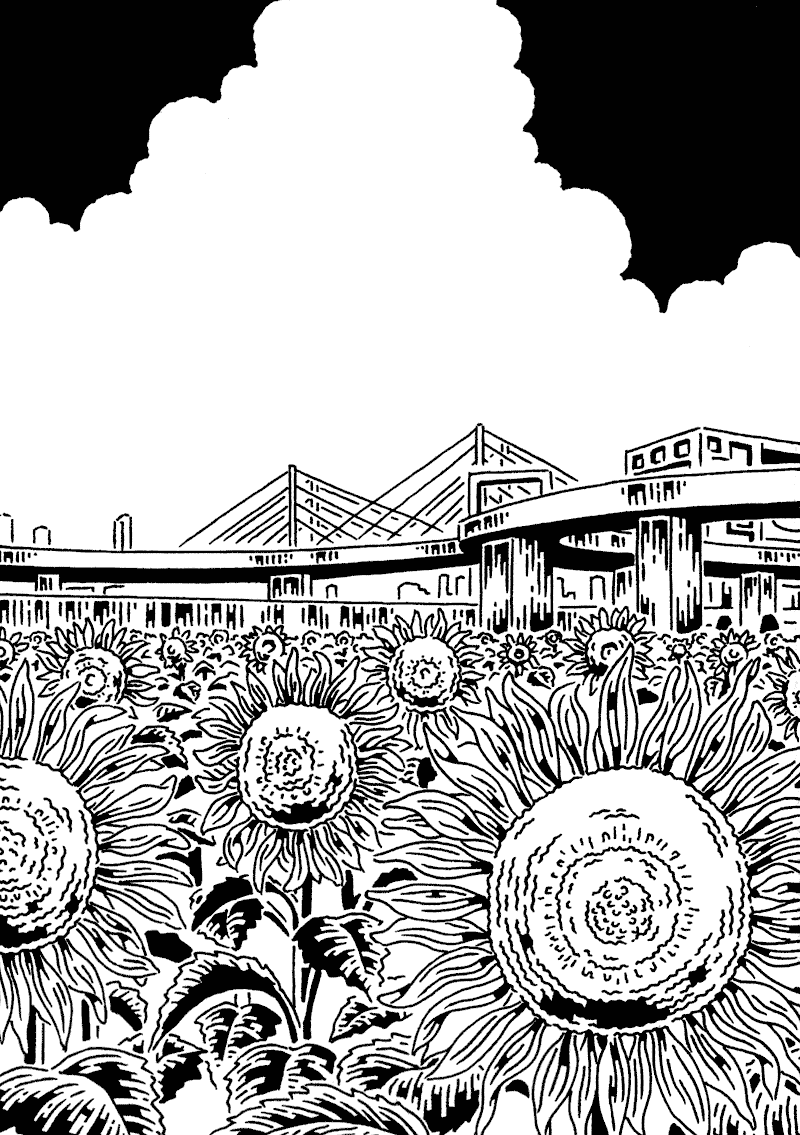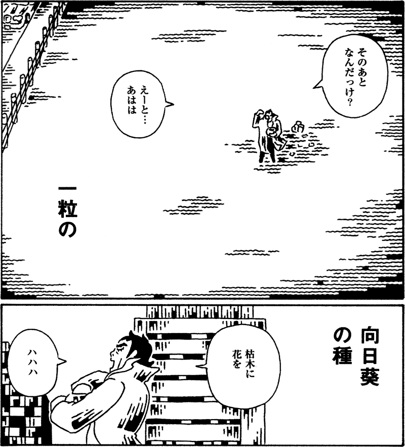 『東京命日』では種蒔きの後日、一面に向日葵が咲く光景が描かれる。生命力あふれる向日葵は、男達の輝かしい夢、それを追い求めた生き様の象徴であろう。種がたくさん蒔かれることで引き出されたこの風景は、『東京命日』のなかでは必然だ。無数の人々の夢が乗算され、膨らんだ圧力に耐え切れず破裂した、それこそがバブル崩壊だったからである。