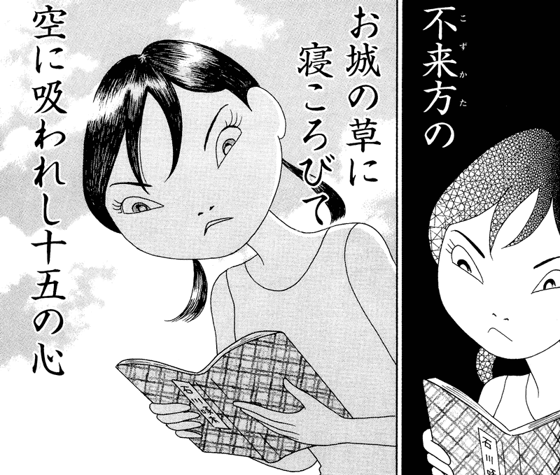 漫画のなかに短歌が登場するとき、レイアウトにかなり工夫が見られる場合がある。例えば次のようなケース。この場面では、登場人物の