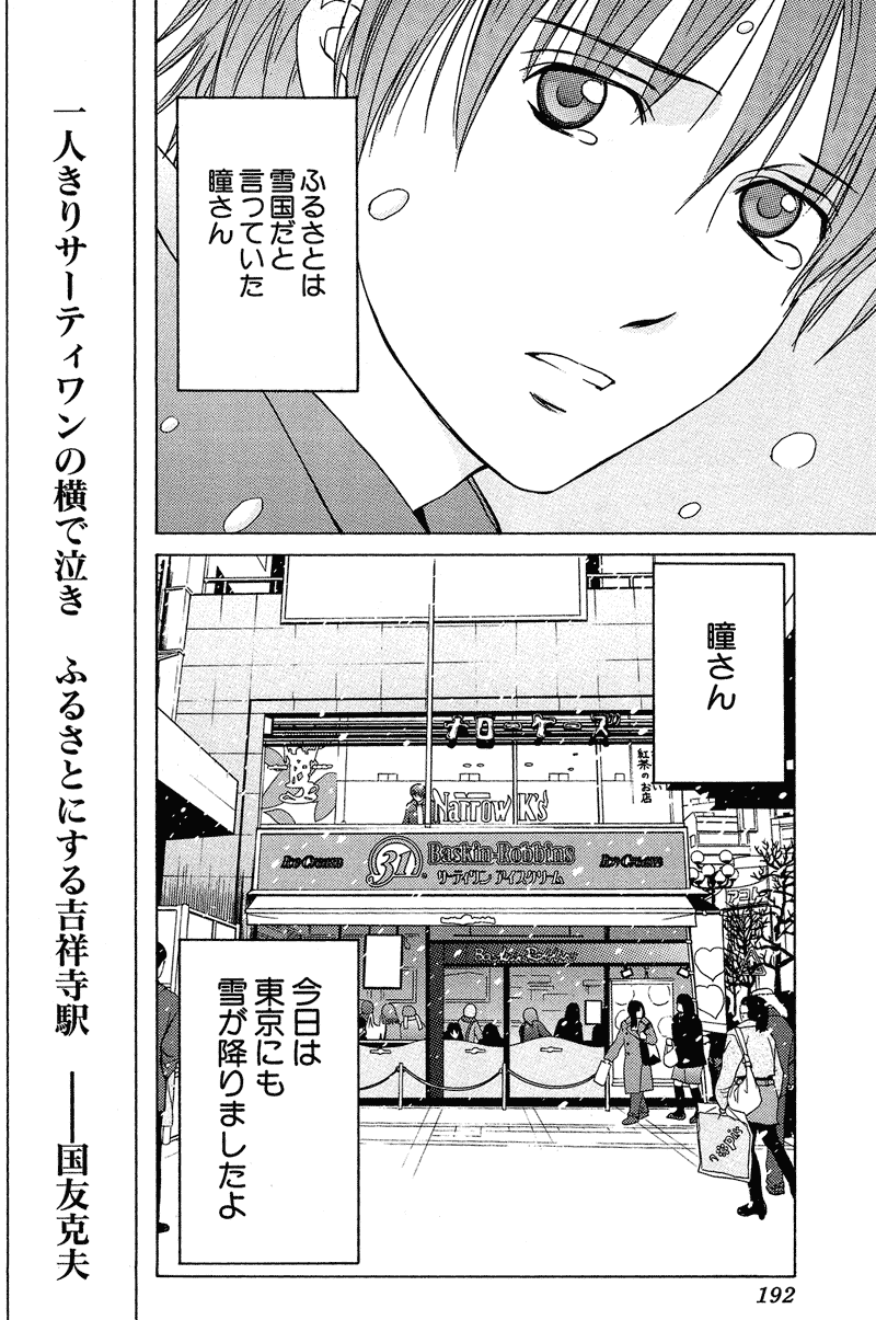 図2のページでは、セリフ部分は適当な文字数で文章を区切っていたのが、短歌で一行あたりの文字数が一挙に増える。読者からすれば、それまで慣れていた斜め方向の読みができず、上下一方向に字を追わなければならない。そのため文字を追うのがぎこちなく、つまり読むテンポが遅くなるのだ。一行書きは、この場面のように掲載歌が物語のなかで重要な意味を持つ場合、その歌をじっくり読ませて印象を深める効果が期待できる。この効果をここでは「縦読み効果」と呼んでみよう。