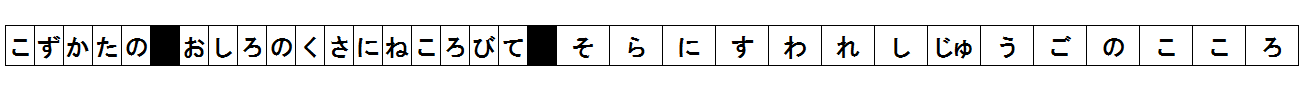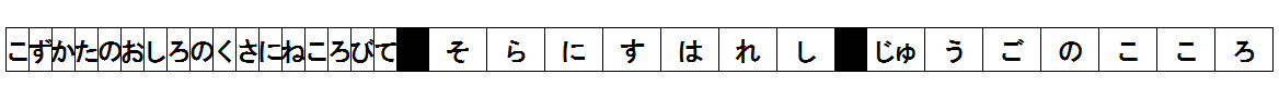 図1の表記で読んだ時のリズムをまとめて、上のように表記してみた。マスの幅は一文字を読む時間を表し、幅が広いゾーンほどテンポが緩やかであることを意味する。黒いマスは休止を表し、幅が休止の時間を表す。なお各マスの幅は時間の比率をそのまま反映しているわけではなく、あくまで長さ/短さの度合を相対的に表している。
