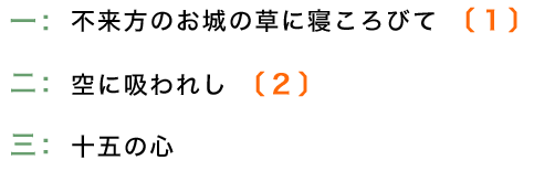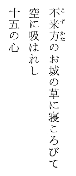 一行目、最初の「不来方」まではよく意味が分からない。ただ字面から「来し方」つまり「過去」をイメージする。「お城」まで来て「不来方」が城にかかっていたことが分かるので、固有名詞なのだなと理解する。回想というか蜃気楼のような漠然としたイメージの城である。なお不来方城(盛岡城)に筆者は行ったことがないので、現物は思い浮かべない。「草に寝ころびて」で、自分は草の匂いと触感を背に感じ、城に視点を固定する。ここまでテンポの速さも手伝って、あっという間に歌の世界ができあがる。一行目を読み終わったとき、私のその世界に既に引き込まれている。