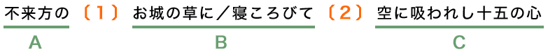 テンポは速い順に一>二=三であるように感じられる。相対的に一行目が二、三行目より速いように感じられる理由は、「不来方の」まで読んだら続く「お城の」が目に飛び込んできて、あれよあれよと「寝ころびて」まで読まされるからだ。しかし「空に吸はれし」は、前後に小休止があるため、ゆったりと余韻に包まれる感じがする。一行目からの落差で、テンポは遅く感じられる。続く三行目にもそのテンポは引き継がれる。